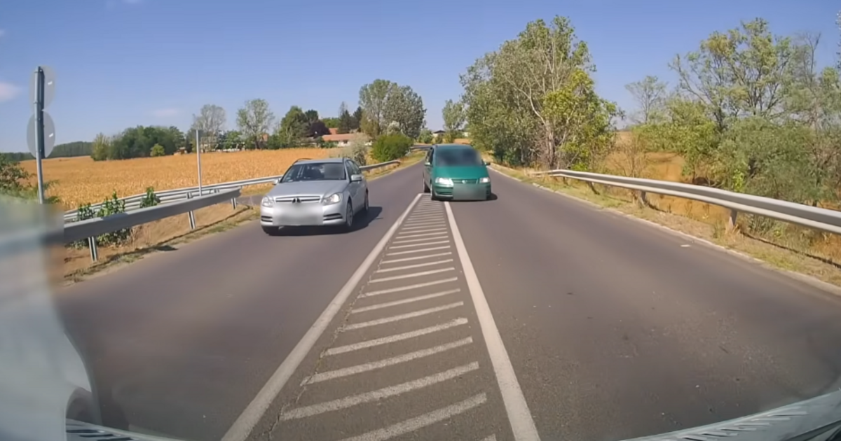 A felvételen egy zöld autó közelít a védett úton, míg egy ezüst színű Mercedes sofőrje figyelmetlenül kanyarodik ki előtte. A zöld autó sofőrjei bravúrosan vetette magát vissza az úttestre, megakadályozva ezzel egy potenciálisan tragikus ütközést.
